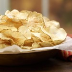- Wash and dry the potatoes. Using a sharp knife, slice the potatoes, thin, but not too think where you can see through them. Place sliced potatoes in cold water. Let sit for 5 minutes and then drain water and repeat with fresh water. Do this 3 times.